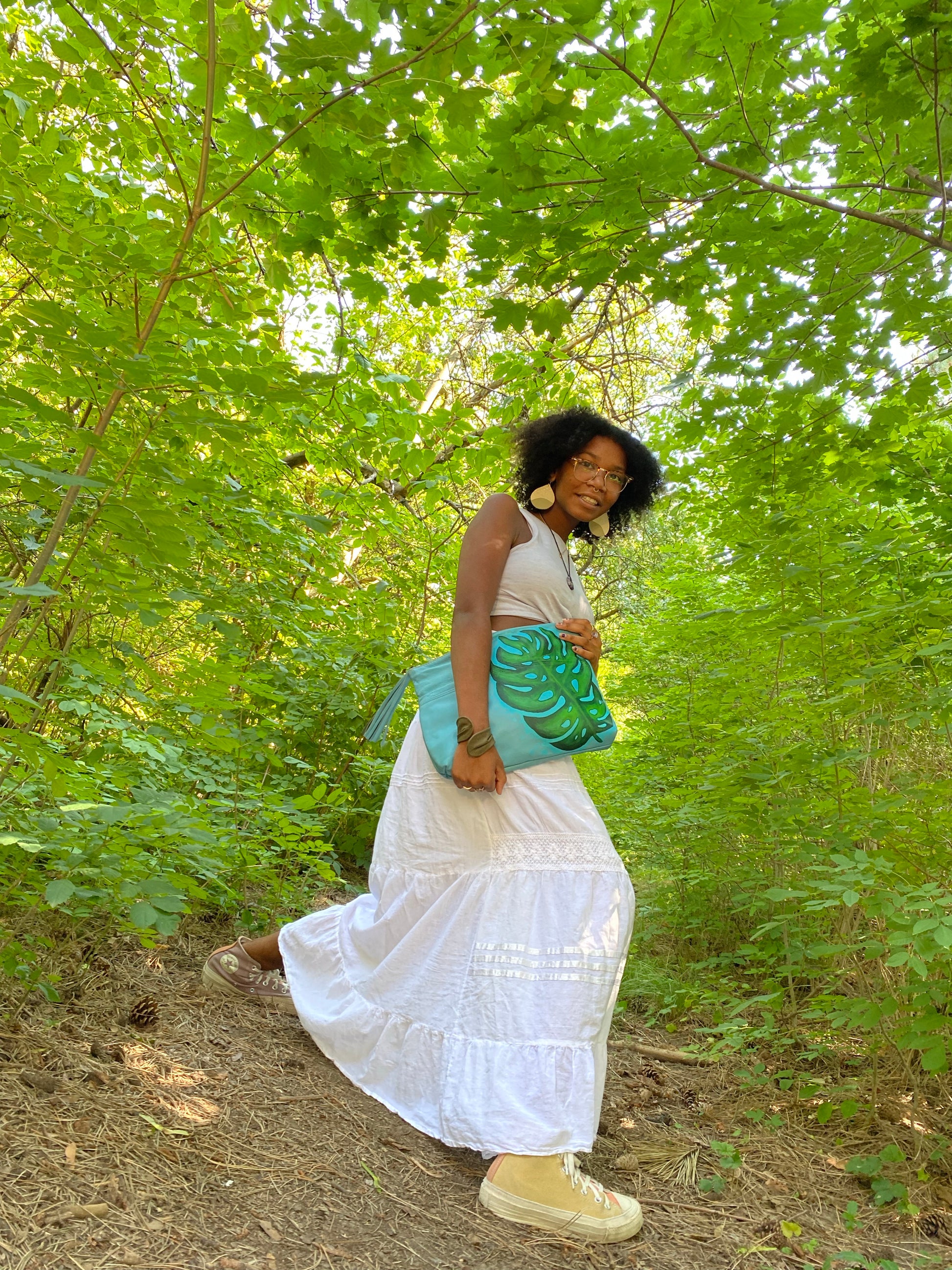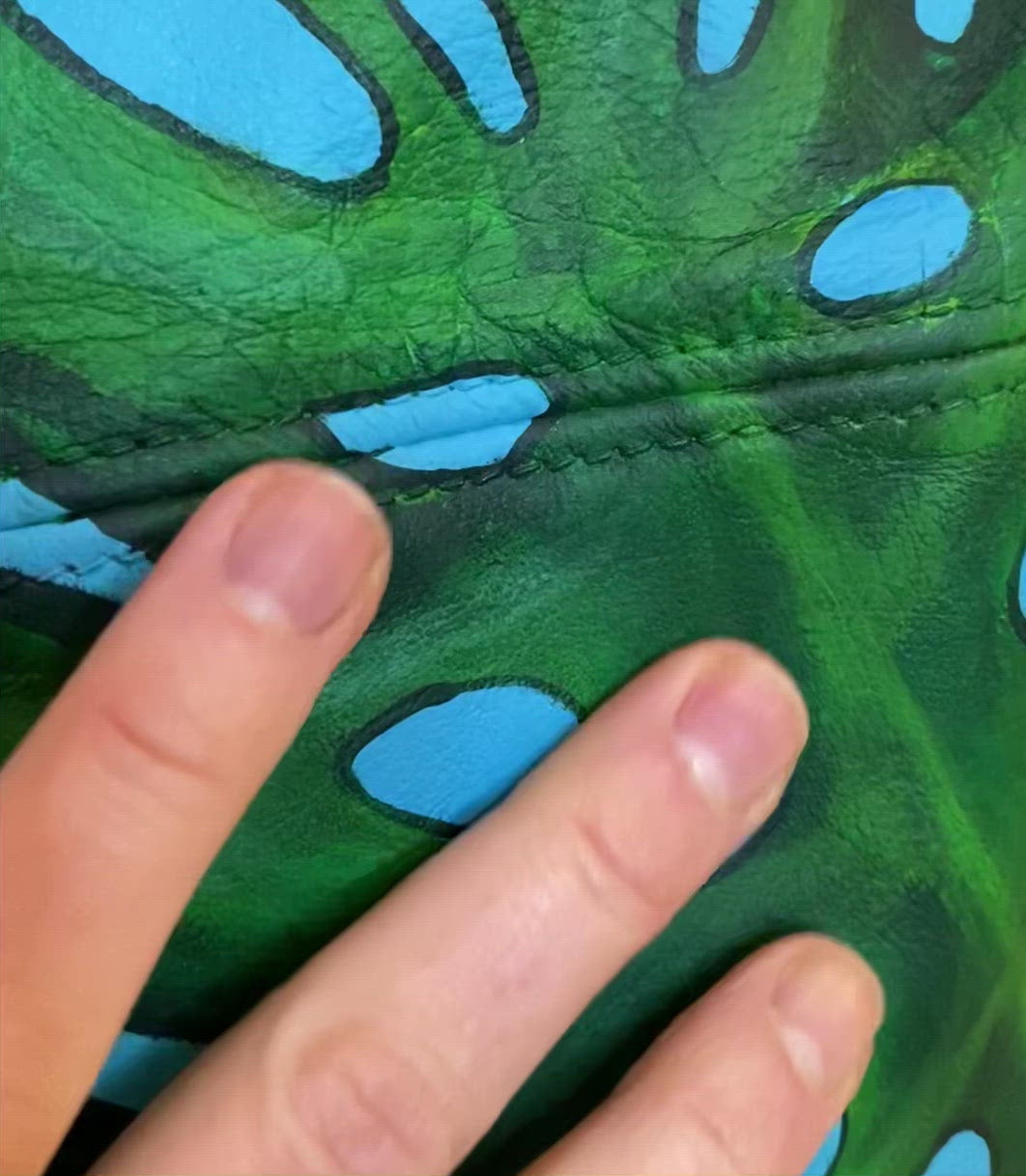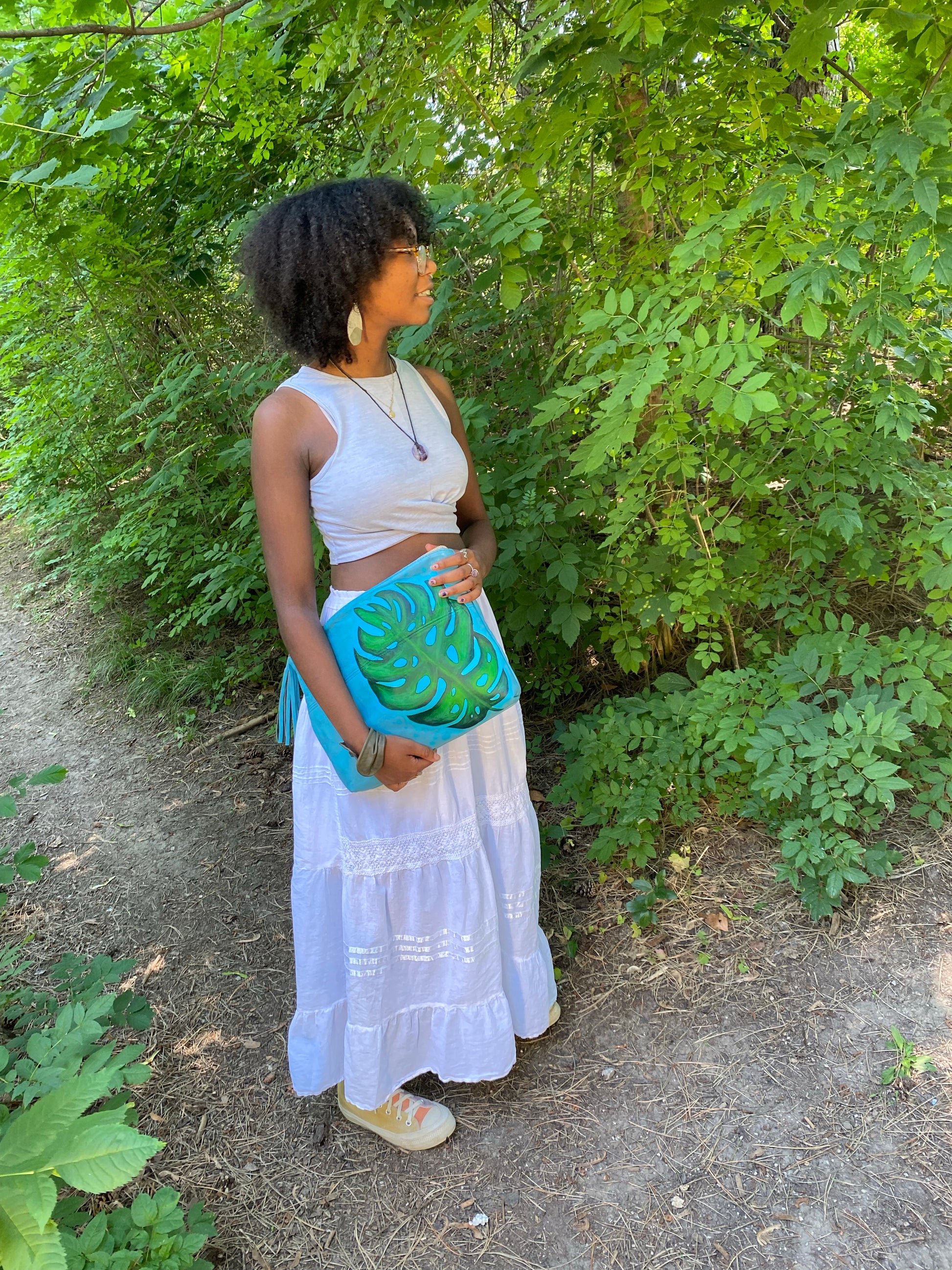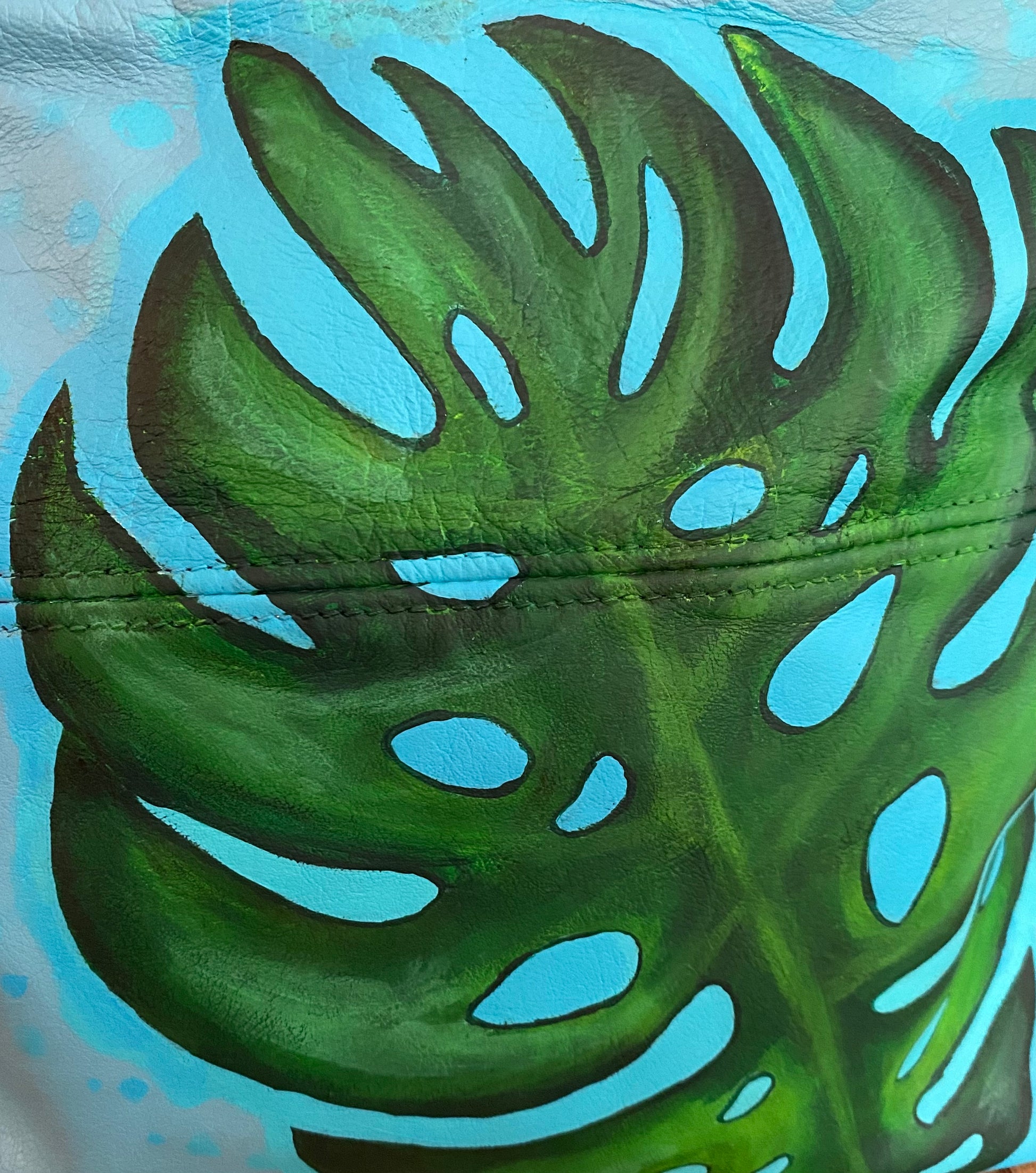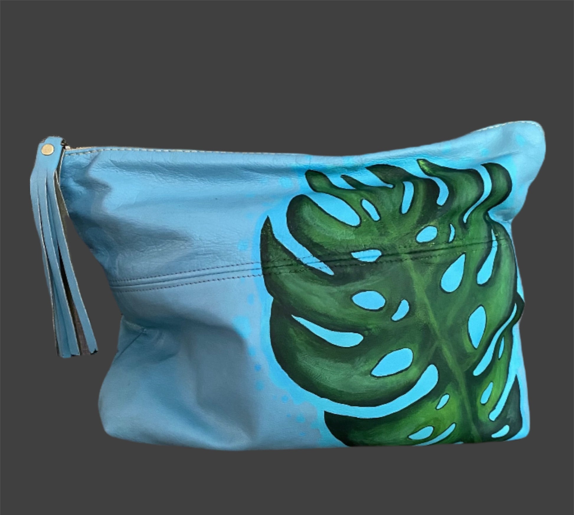 This is a gorgeous collaboration with the talented Danielle Fonseca of @dtasha. Hand painted 10” x 10” Monstera on turquoise reclaimed leather oversized clutch.